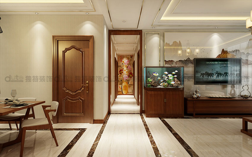 整體方案以新中式風(fēng)格為主,主要采用米色系列,戶主是一對(duì)中年夫妻,整體裝修以穩(wěn)重得體為主。整套方案空間感比較良好,整個(gè)家的墻壁使用米色壁紙,顯得更加穩(wěn)重大氣。吊頂造型采用回字形吊頂和地面的拼花進(jìn)行一個(gè)呼應(yīng),客餐廳地面整體采用米色系列拋釉大地磚通鋪。過(guò)道采用45°斜鋪將整個(gè)空間區(qū)域劃分開(kāi)。搭配上簡(jiǎn)約舒適的棉麻材質(zhì)的布藝沙發(fā),簡(jiǎn)單而又靜雅,是整個(gè)家的靈魂色所在。